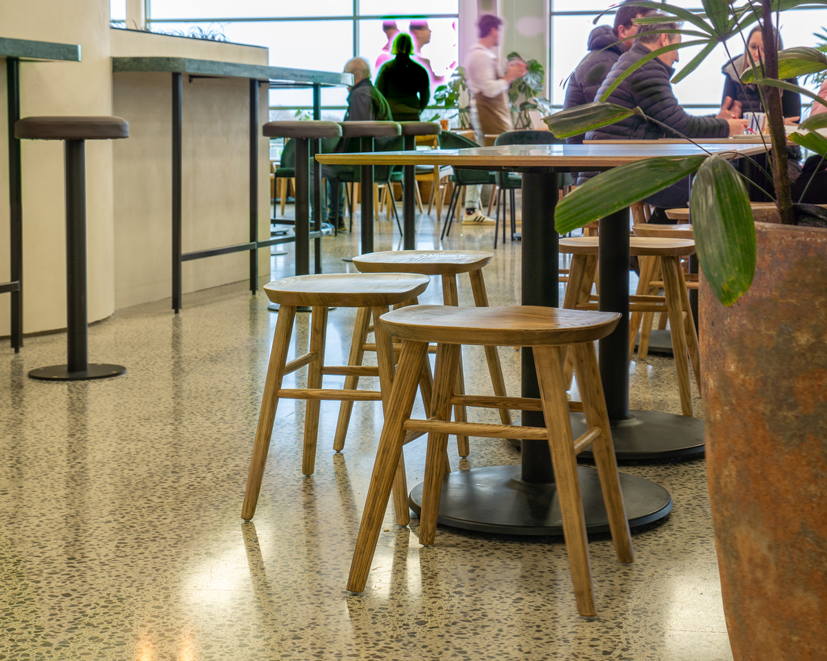 Low stools typically measure around 45cm, designed to pair with standard dining table heights of about 75cm. This makes them a practical alternative to dining chairs in both cafés and homes.