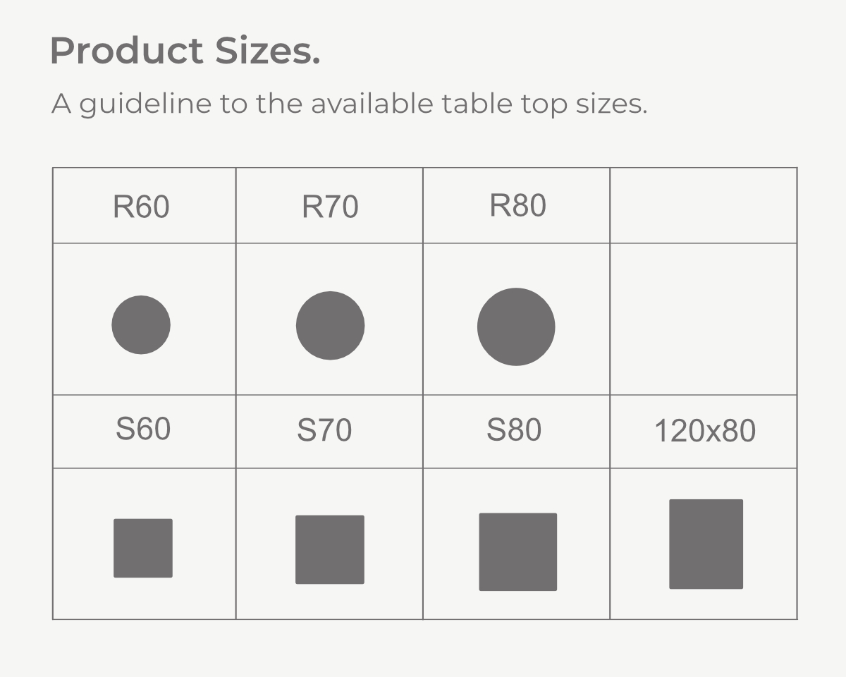 Circular, square & rectangular sizes: A shape and size to fit into your space.
