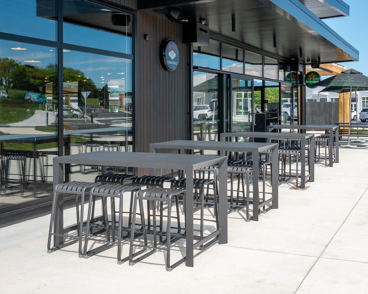 Raglan bar leaner paired with Atticus stools outside The Village Green in Omokoroa.