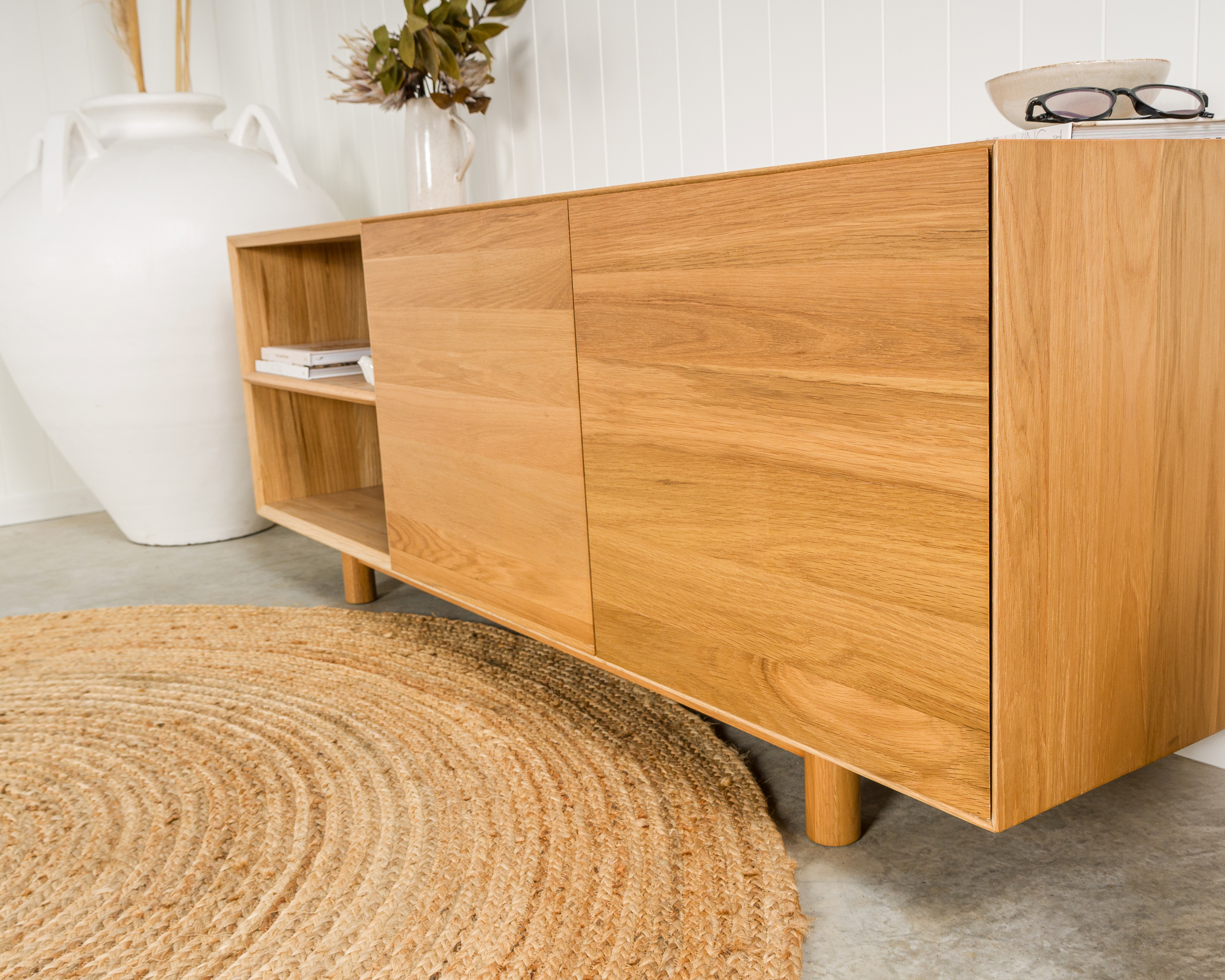In a living room it anchors a wall, balances the visual weight of a sofa, and gives you somewhere considered to keep the things that would otherwise end up on every surface in the room.
